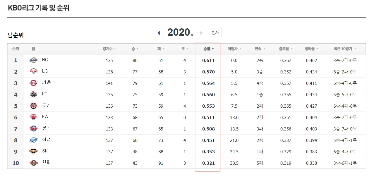 팀별로 승률 계산 경우의 수를 알아보자. 2020년 10월 21일 경기 전 기준이다.
