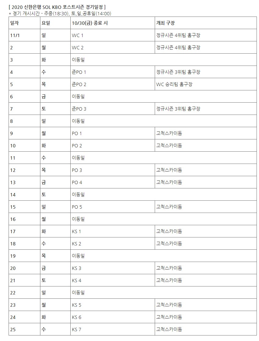 아래의 표는 KBO 에서 제공하는 2020 프로야구 포스트 시즌 경기 일정이다.