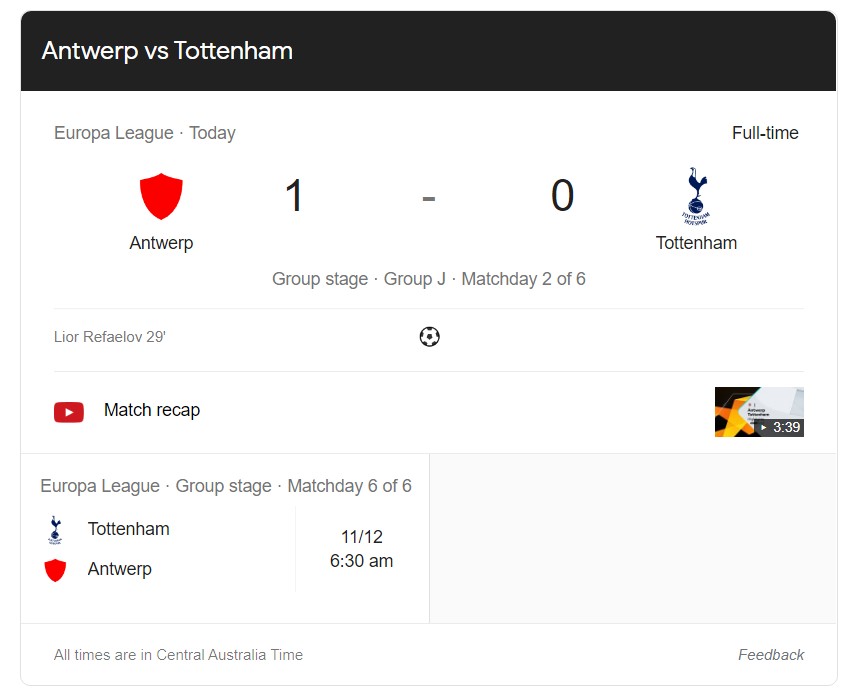 전체적인 평가를 내려보자면 토트넘이 잘 못했다. 그와 동시에 앤트워프도 잘했다. 토트넘을 정확히 적재적소에서 막아냈다. 토트넘의 공격이 앤트워프의 수비수들에게 족족 막히는 반면, 토트넘의 수비수들은 앤트워프의 공격에 털털 털리는 느낌이 있었다. 벨기에 앤트워프에 손흥민만 한 골게터가 있었다면, 토트넘은 대패를 당할 뻔했다.