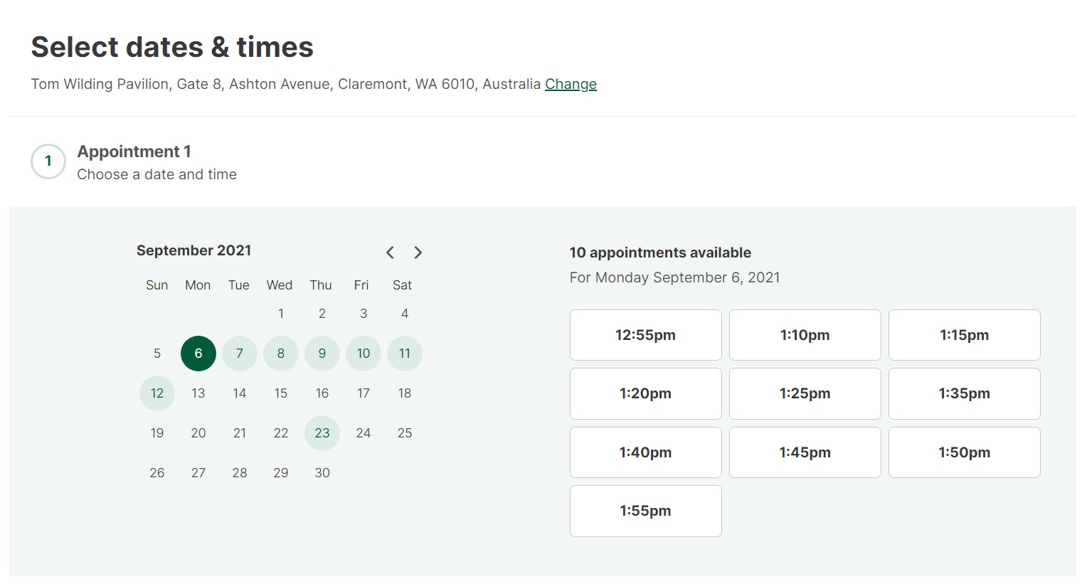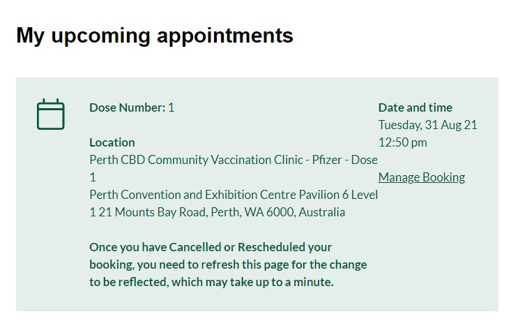 최근 퍼스 컨벤션 센터의 새로운 백신 예방접종 클리닉이 오픈하였으며, 당장 1주일도 남지 않은 상태에서 예약 가능한 날이 있었고, 나는 자동적으로 화이자 백신 접종 대상이 되었으며, 일도 뺄 수 있는 상태였다.