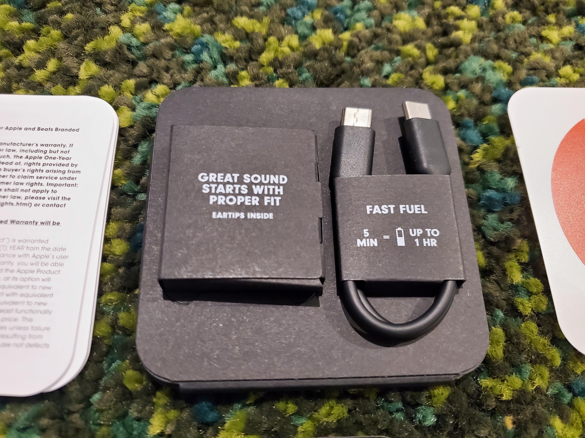 간편 사용 설명서 및 상세 설명서와 C to C 충전라인, 여분 사이즈 이어팁, 보증카드, 스티커, 애플 뮤직 3개월 무료 쿠폰, 본체 등으로 구성이 되어있다.