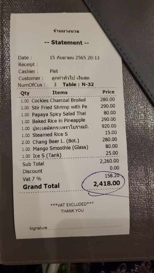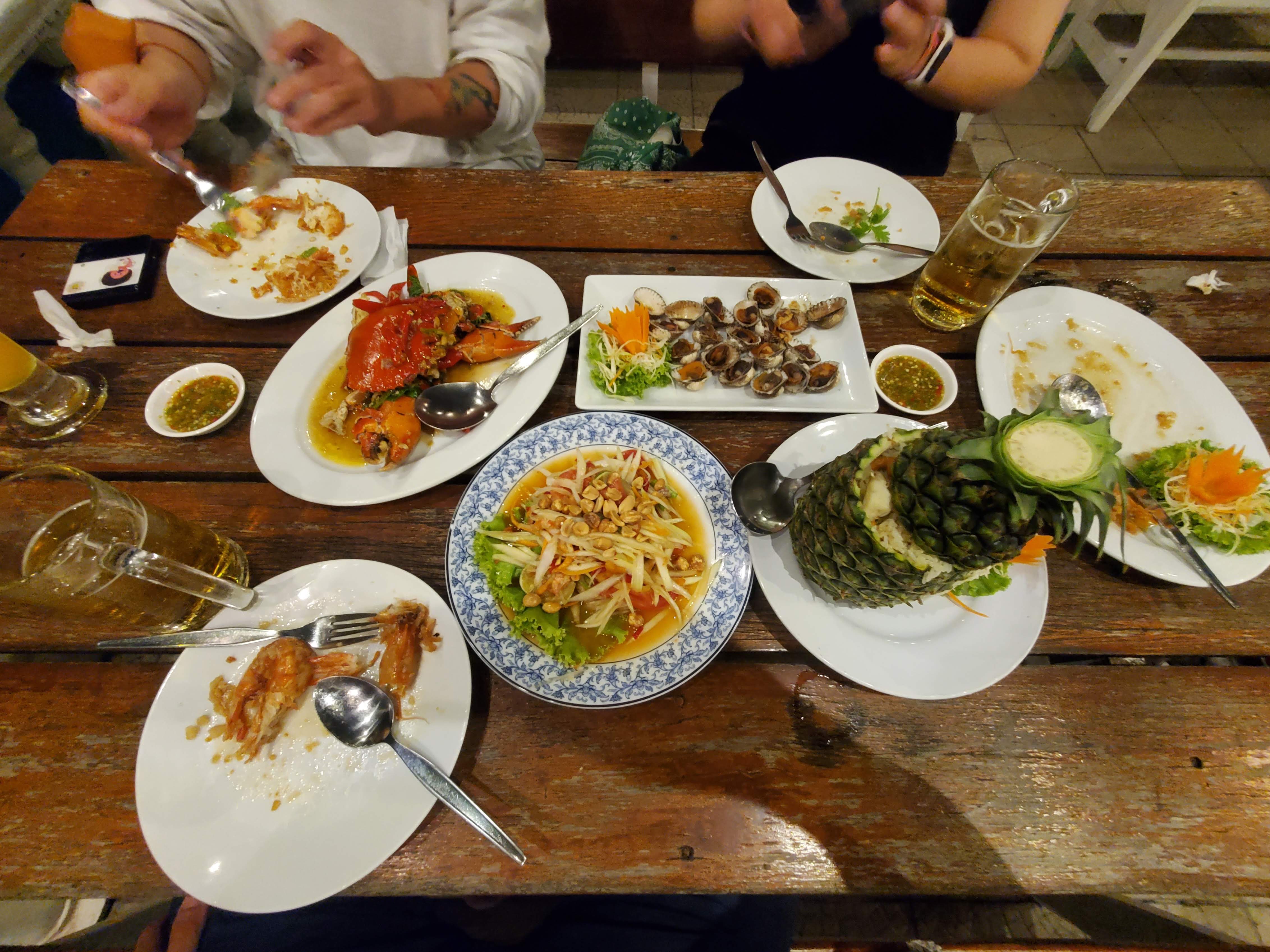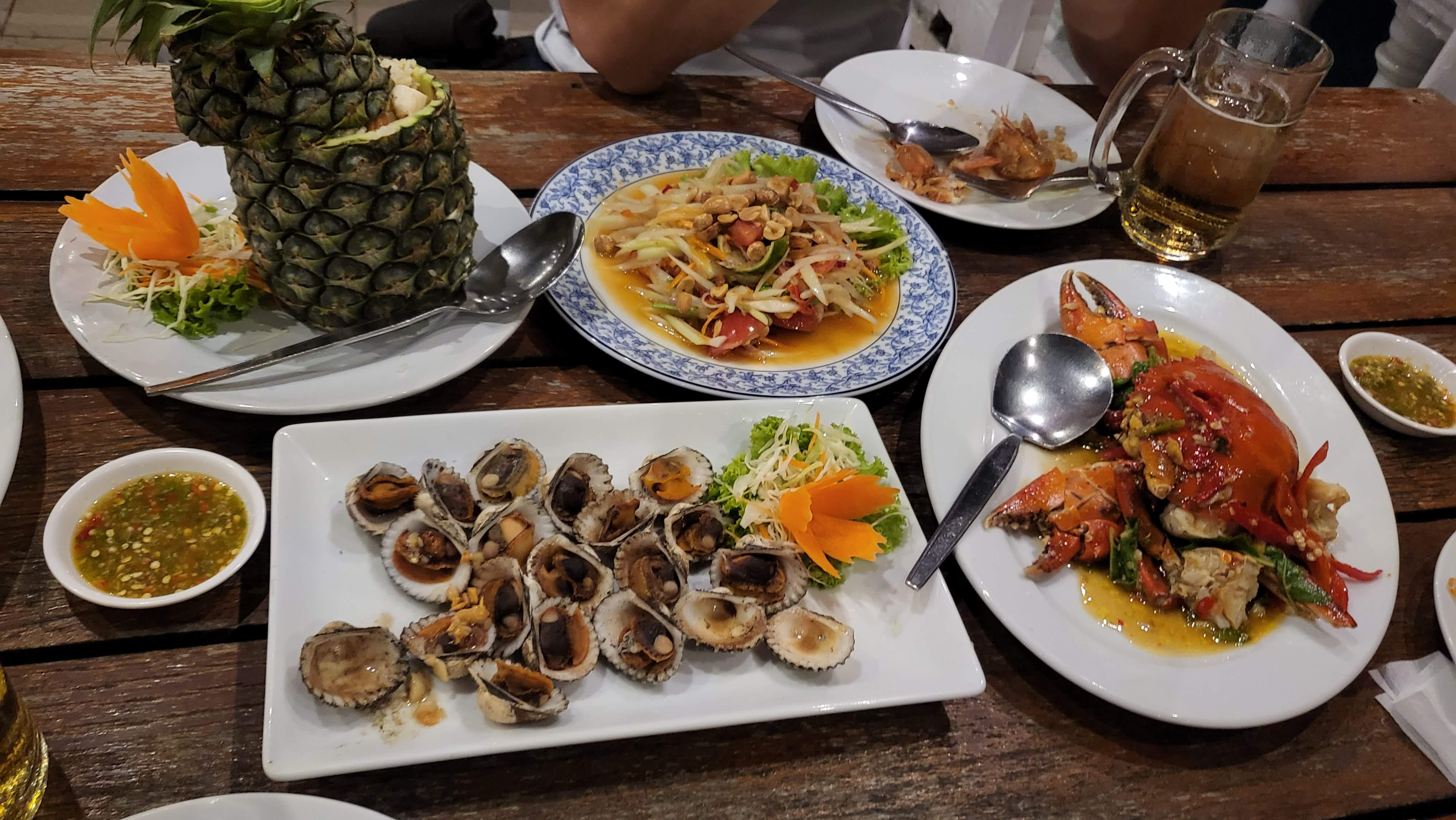 그 외에도 꼬막(280밧 : 약 1만 1천 원) , 파인애플 볶음밥 (290바트 : 약 1만 1천 원) , 칠리크랩 (시가 : 약 3만 5천 원), 쏨땀 ( 80바트 : 약 3100원) 등을 시켜서 먹었는데 대체로 다 만족스러운 맛이었다.