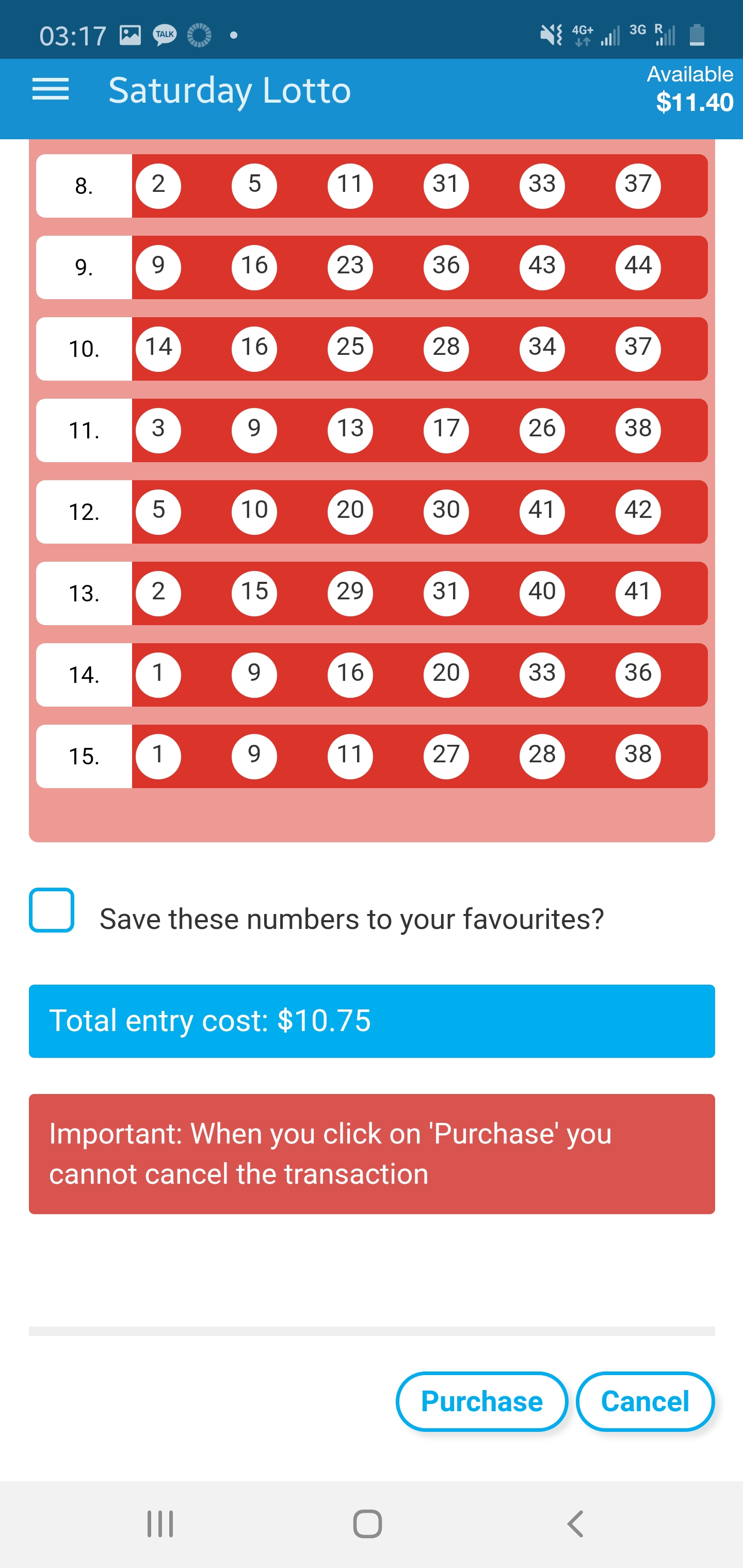 일단 내가 갖고 있는 당첨금 중 10.75불을 토요일 로또 플레이에 사용했다. 10.75불을 내면 15게임이 가능하다. 우리나라 로또에 비해서는 저렴한 편인 듯싶다. 다만 모든 요일별로 한 게임당의 금액이 다르므로 꼭 확인하고 구입해야 한다.